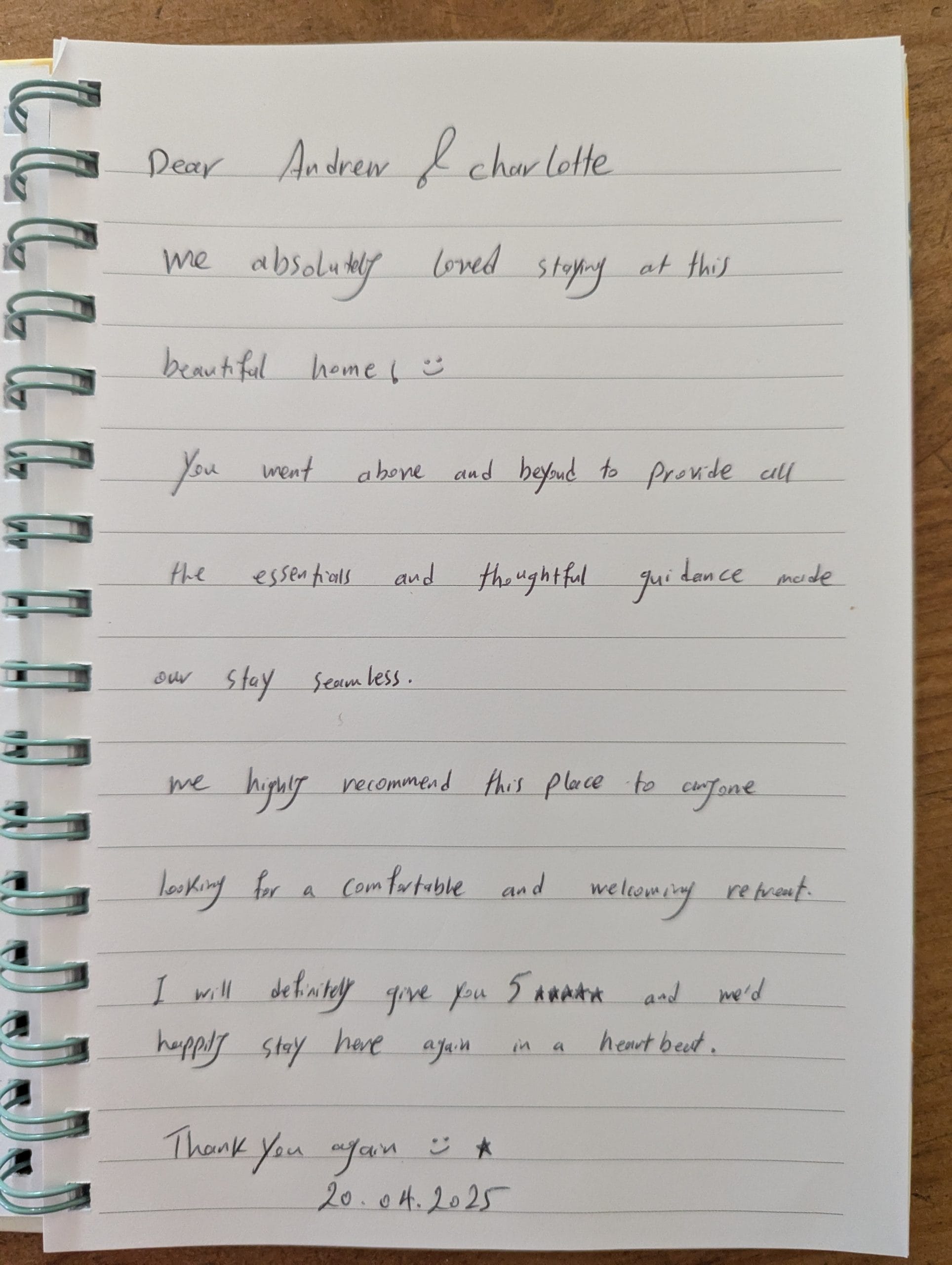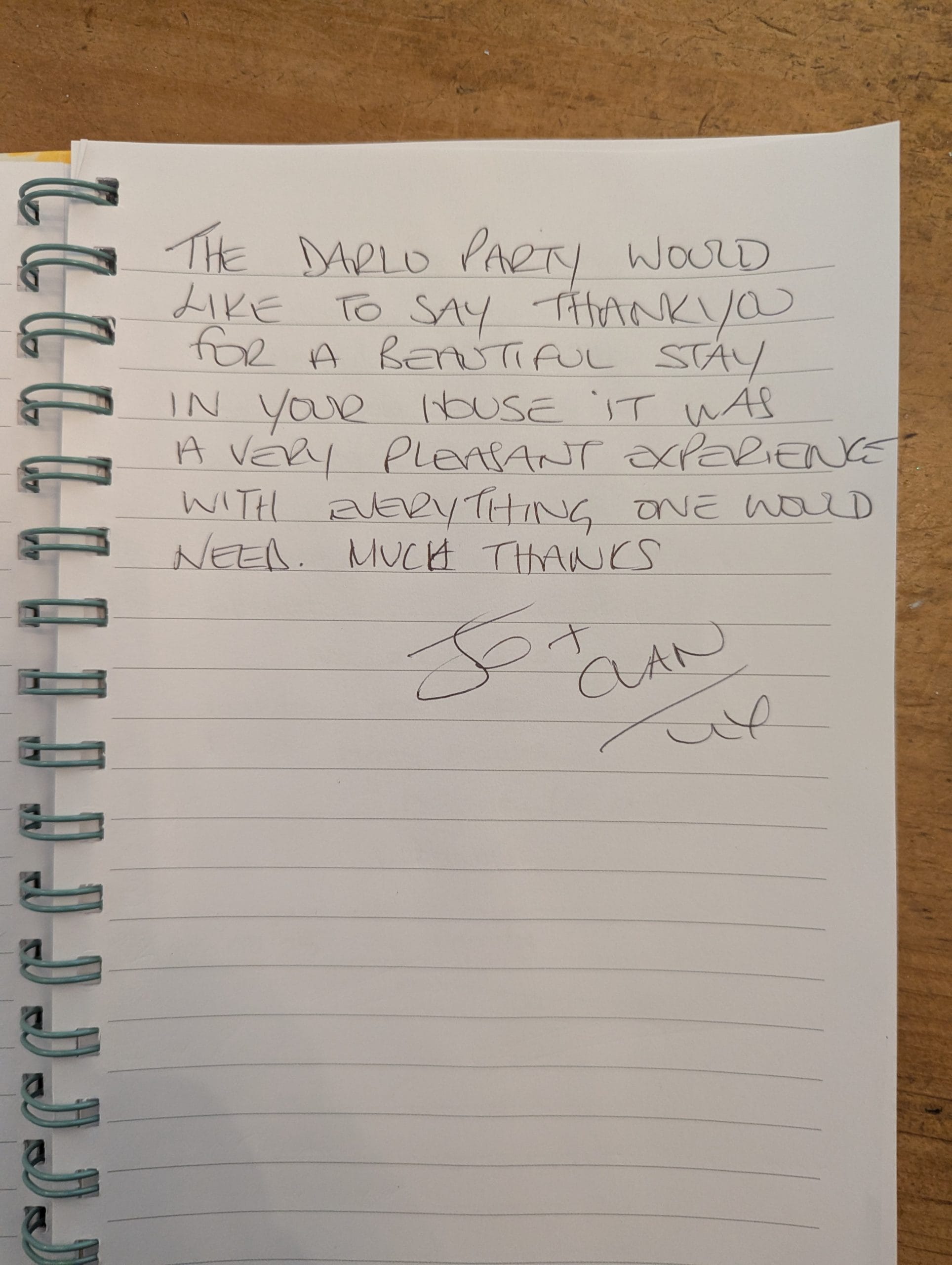 Seyed and his friends were our very first guests and they left this lovely note. Seyed, a property manager by profession, was also generous enough to give us some helpful comment in his private Airbnb notes, which enabled us to make some important improvements for the next guests.