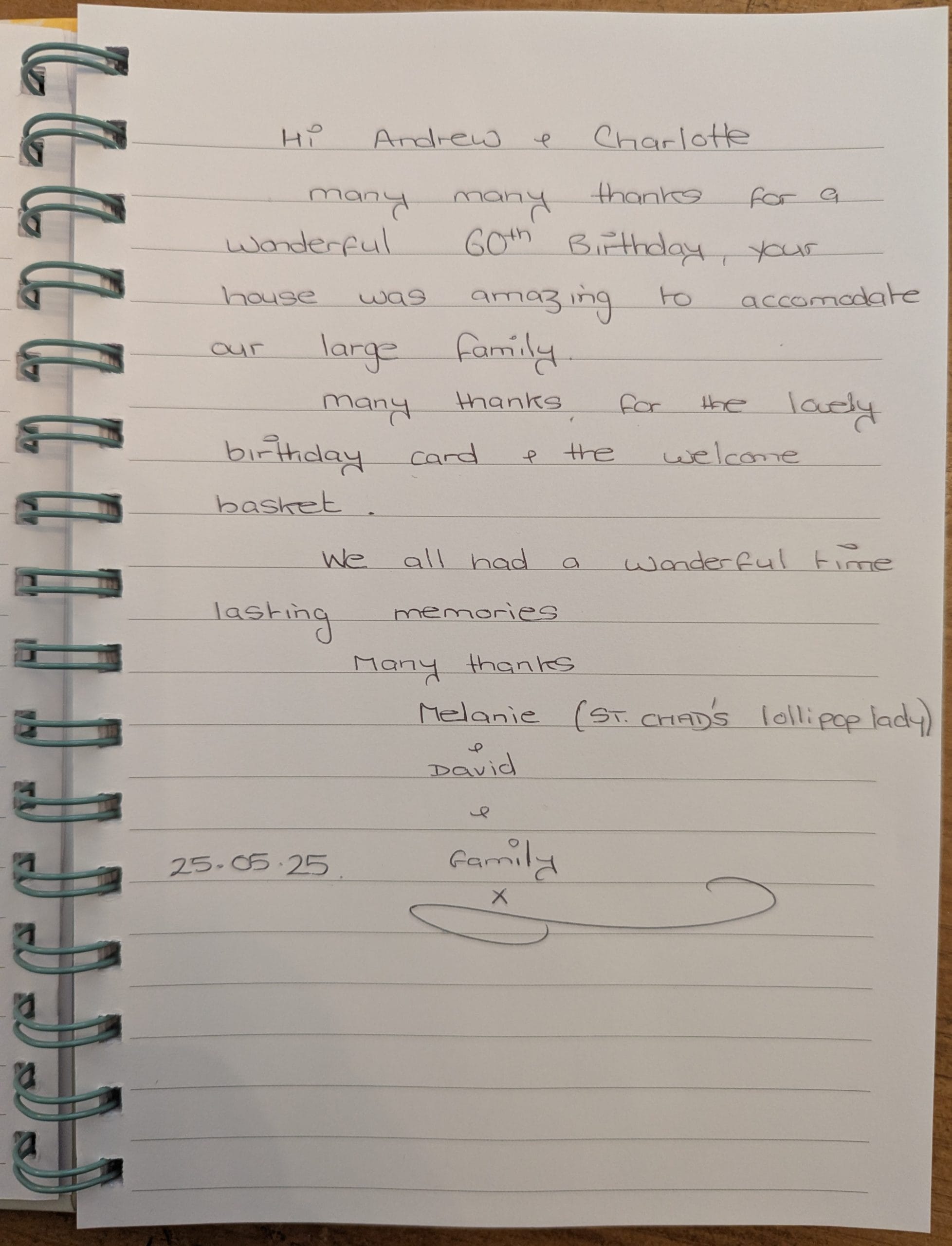 Many many thanks for a wonderful 60th Birthday, your house was amazing to accommodate our large family.