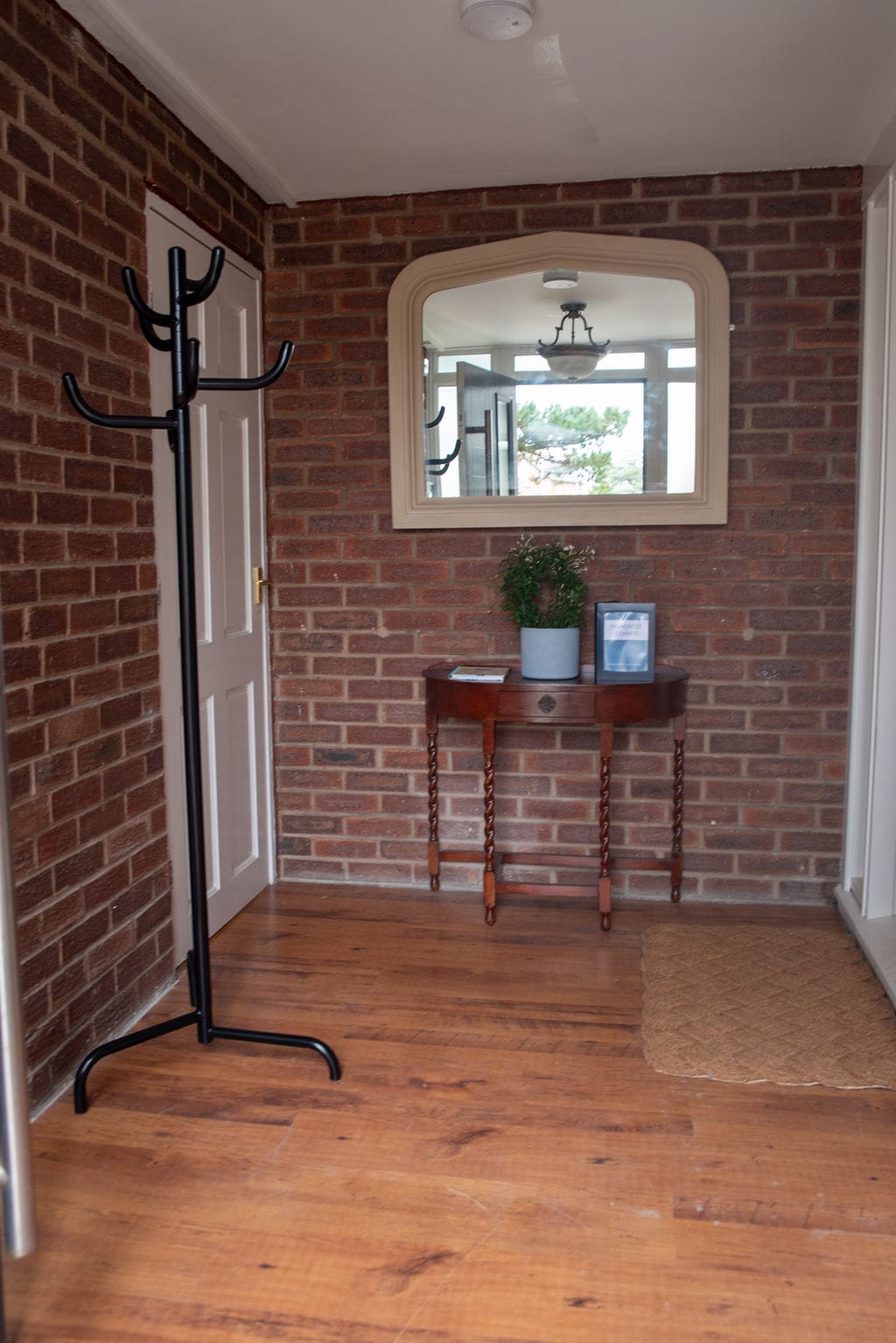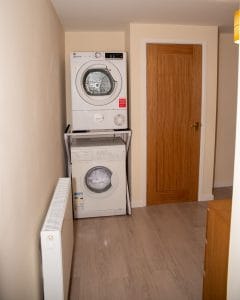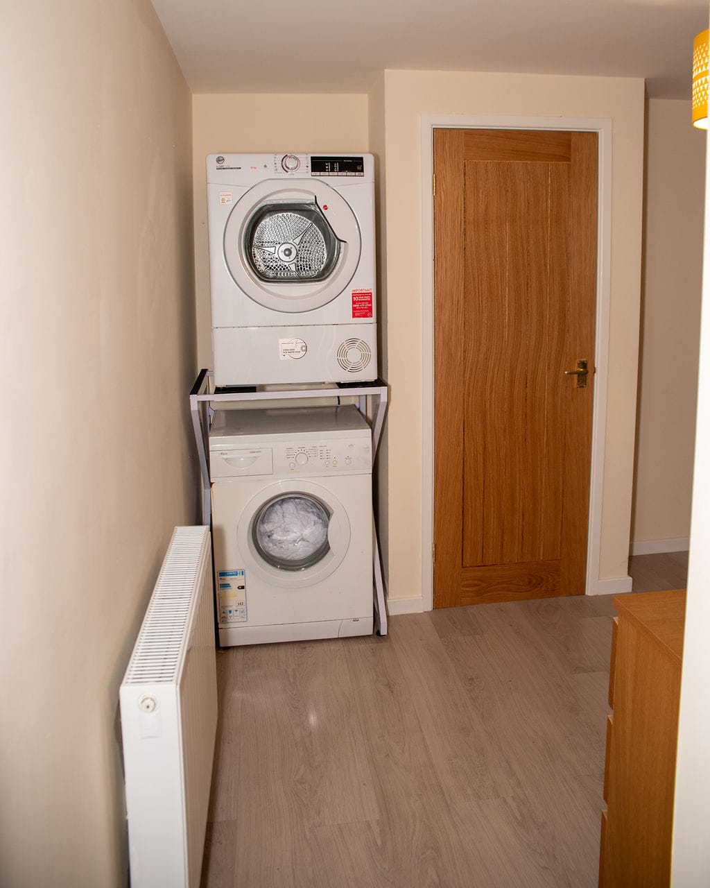In the Hallway you will find the Instruction Book and the Guest Book where you are invited to leave comments. Doors from the hall lead to Bathroom 3, the sitting room, and the Laundry. The laundry has a washing machine (with a few washing capsules provided), a tumble-dryer, an iron, water jug and ironing board, and a laundry basket. The main electricity fuse board and gas boiler are in the Laundry, accessible in case of emergency only – please contact us if you have any problems. There is also a chest of drawers and a cupboard, both locked, for staff use, and a locked door leading to the garage, which is also reserved for staff use.