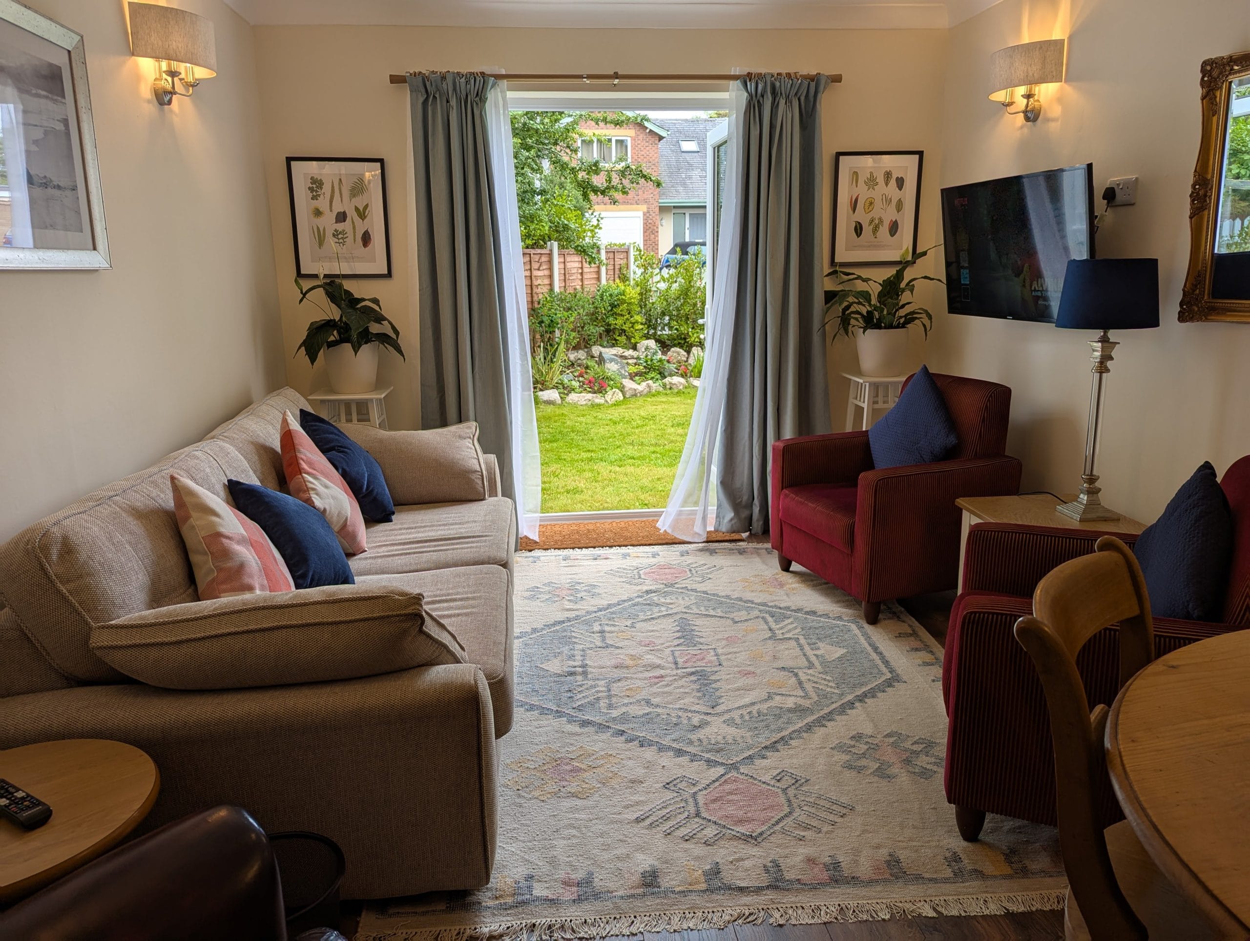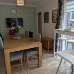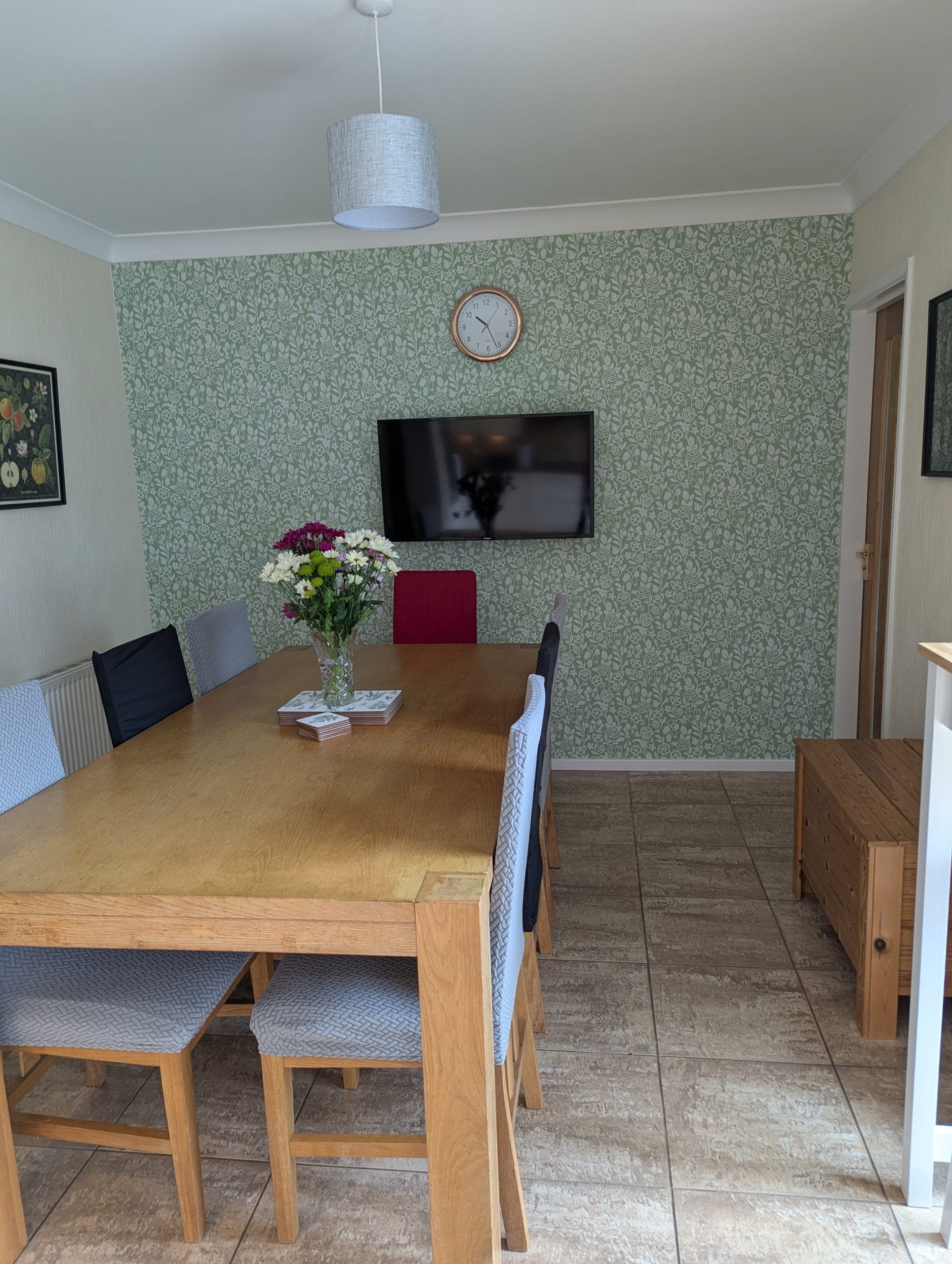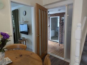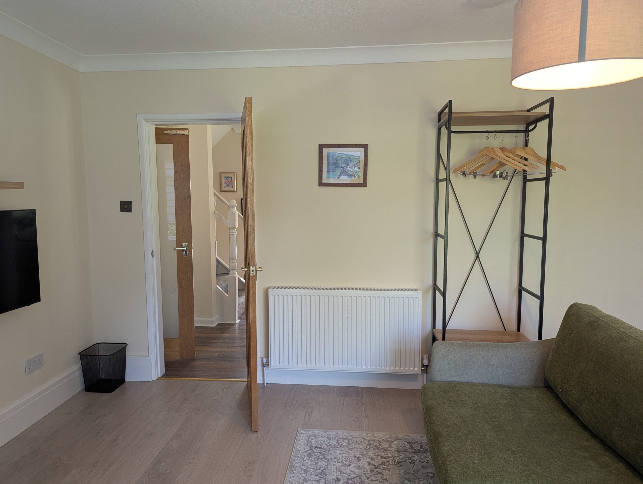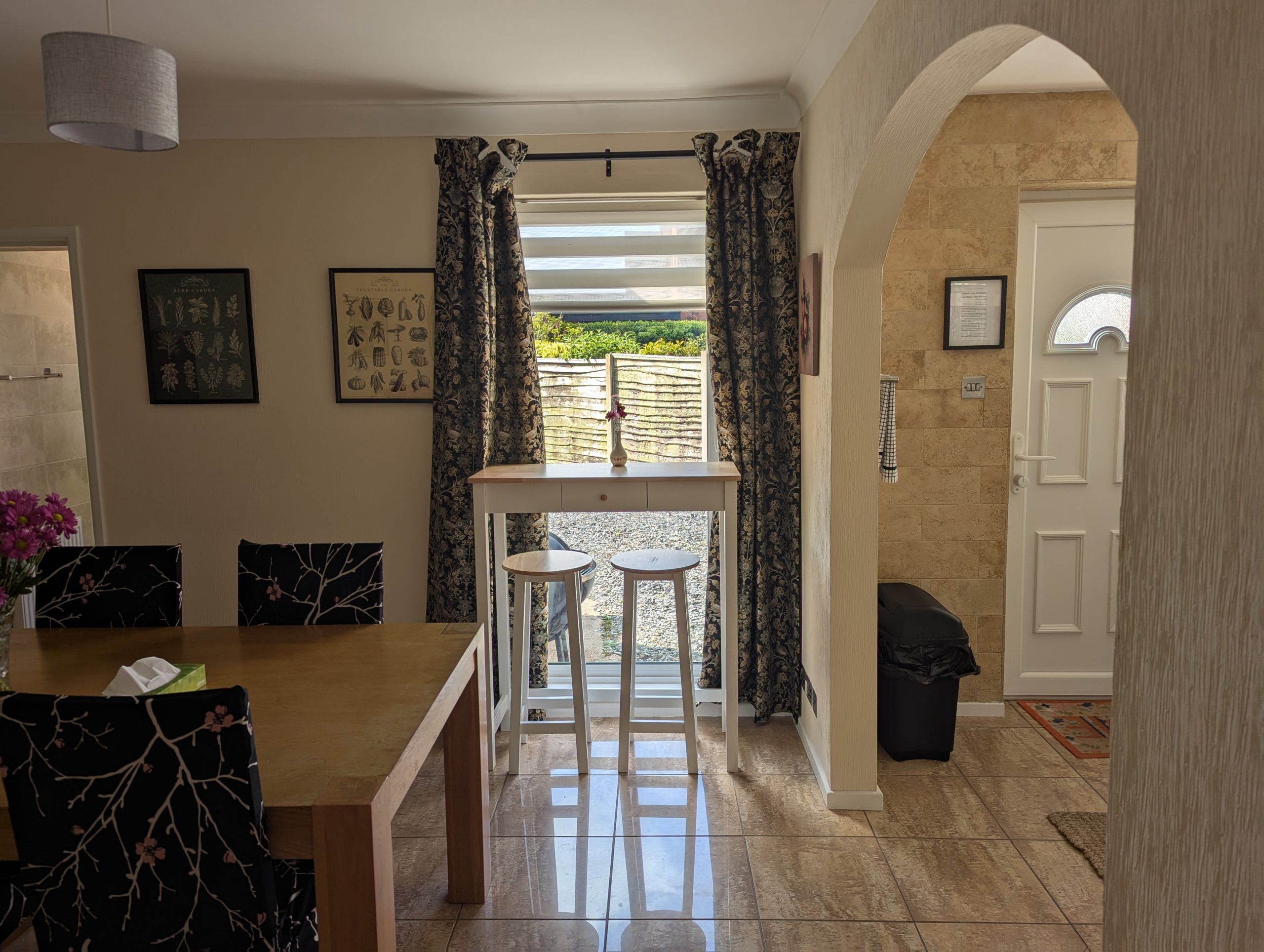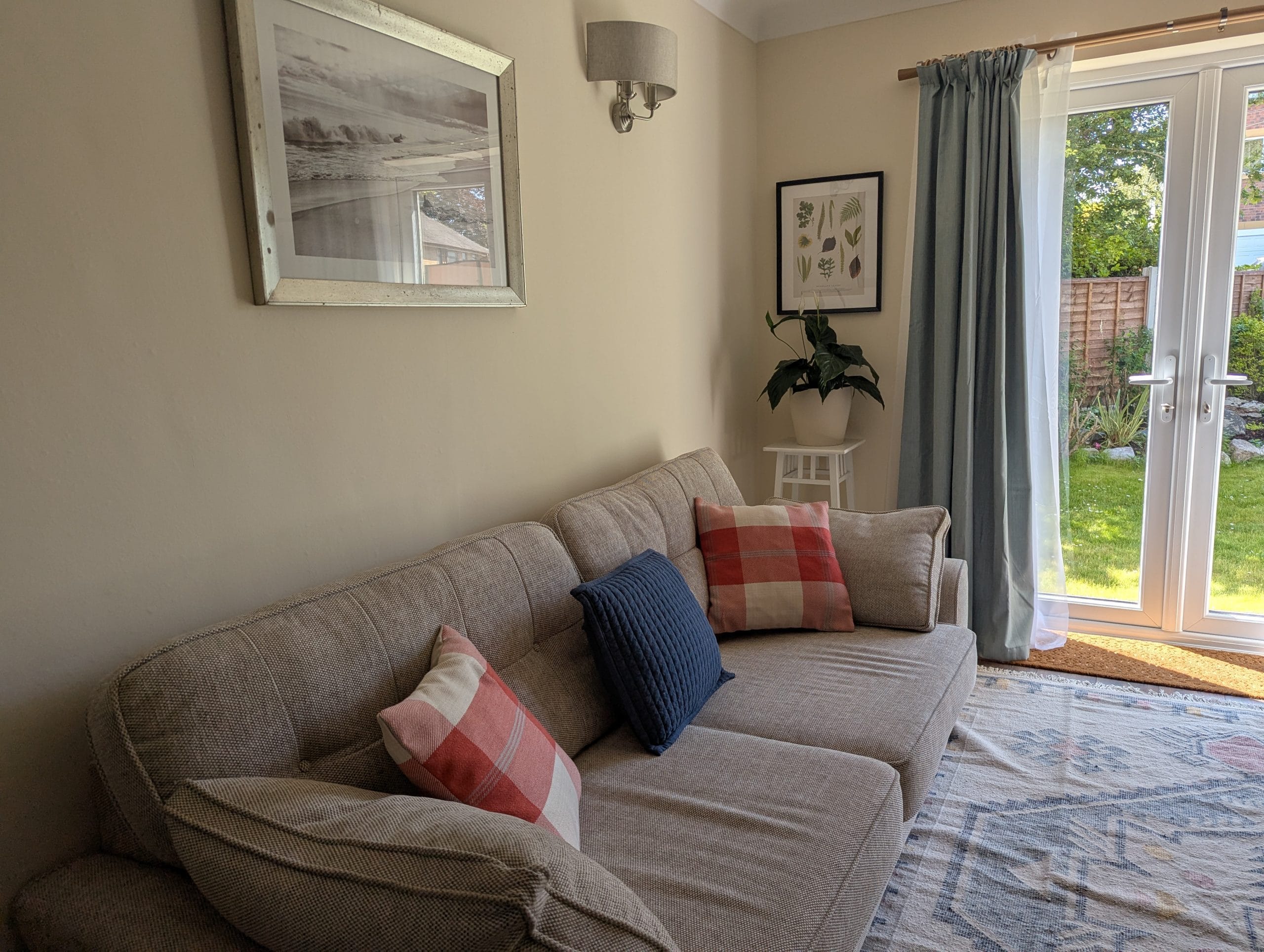3-seater sofa. Round table with 4 chairs. Smart TV with Netflix and Prime. French doors to enclosed dog-proof garden. Stairs run from here. This is one of the possible places we can put spare beds if required, although they do take up most of the spare space.