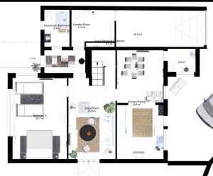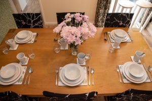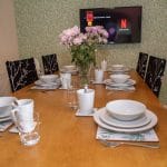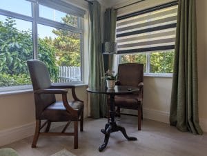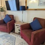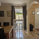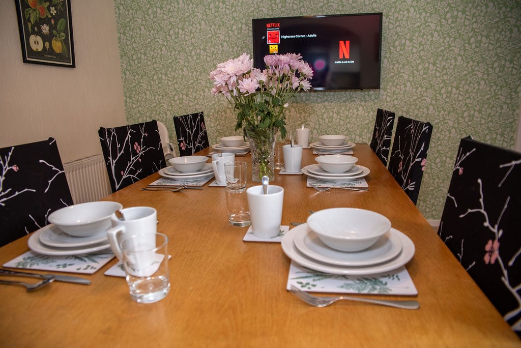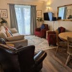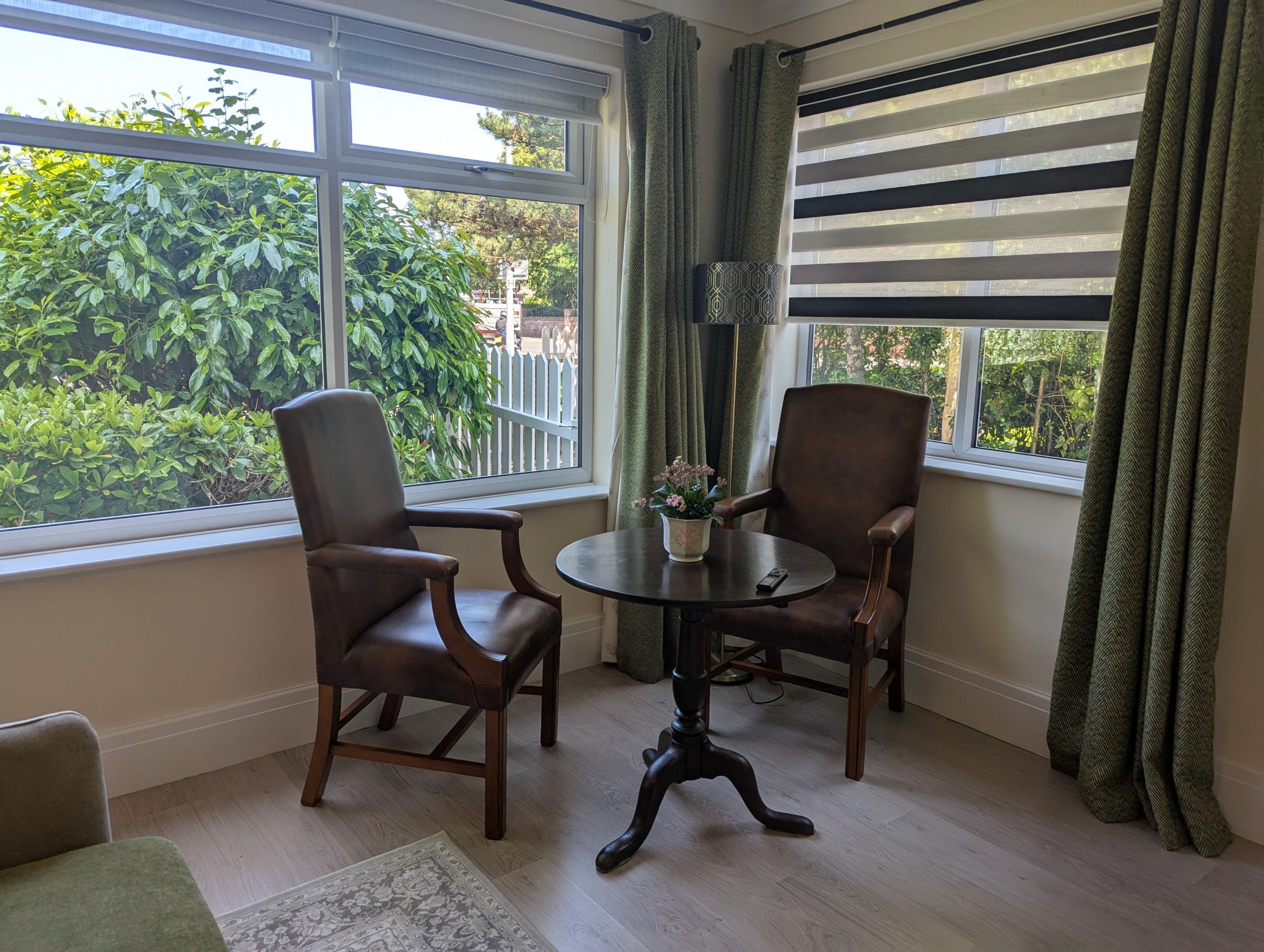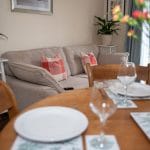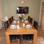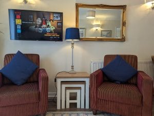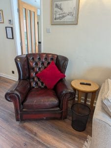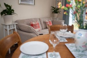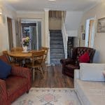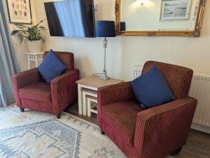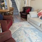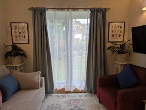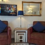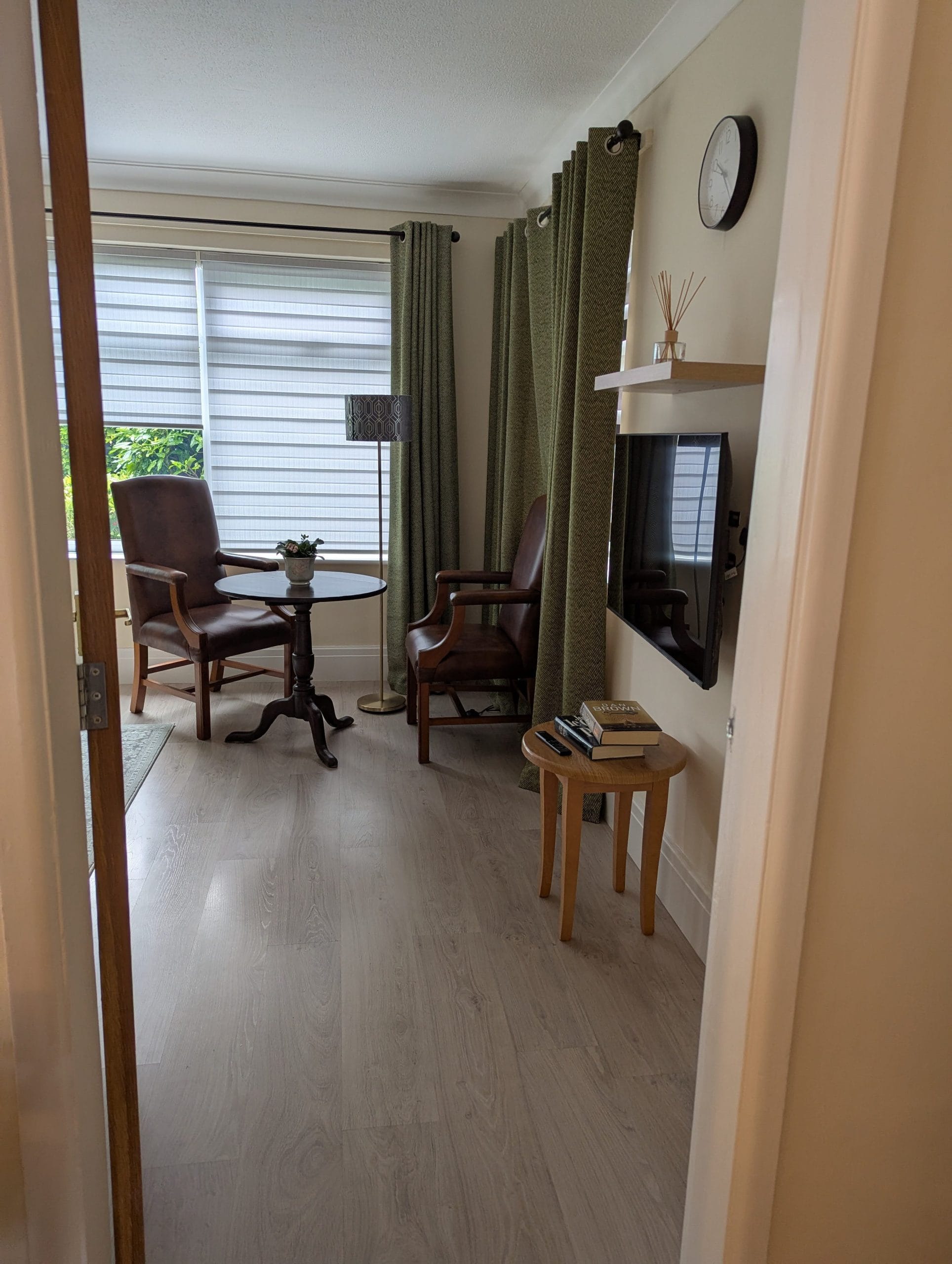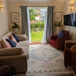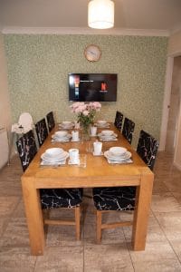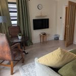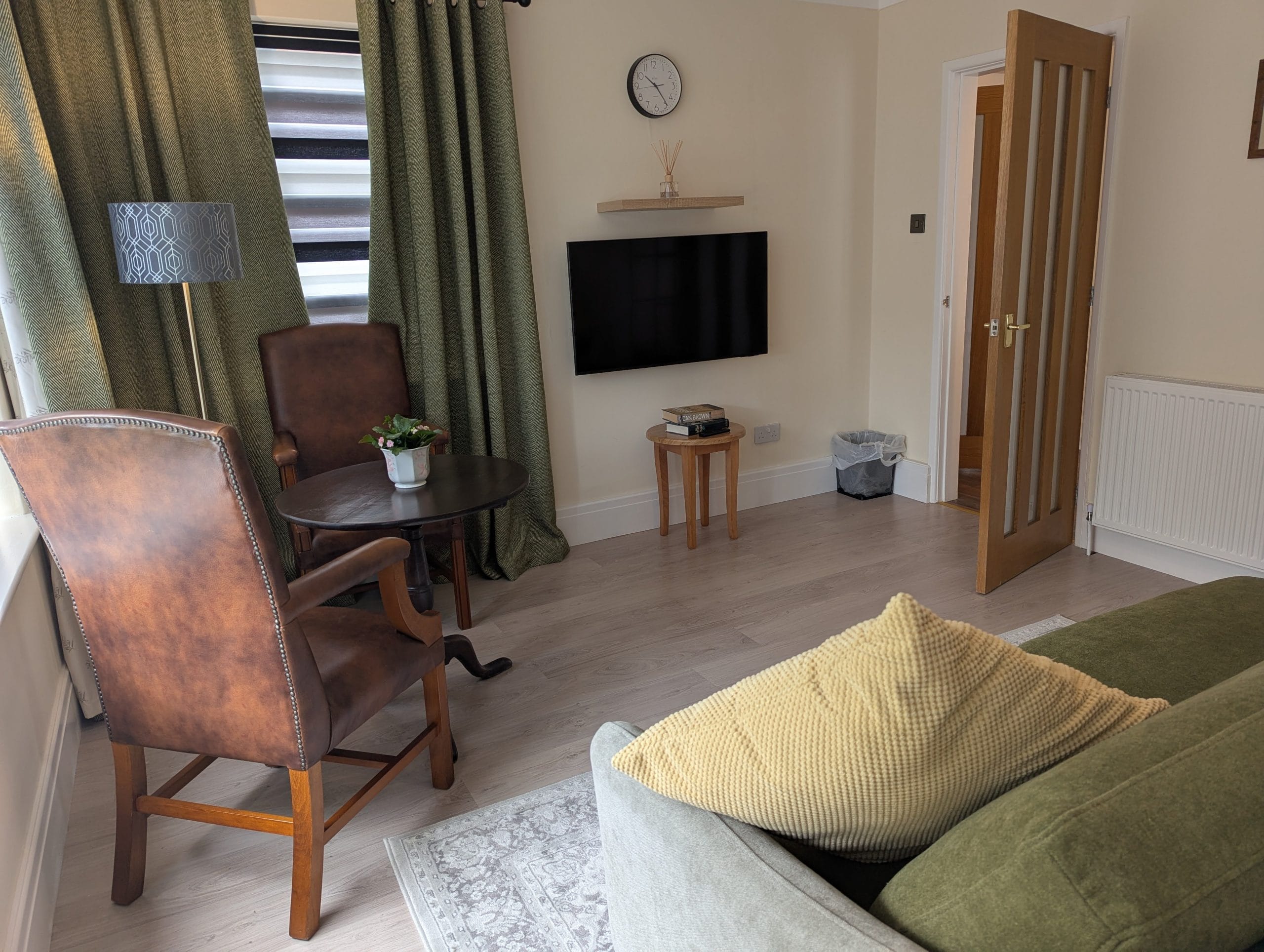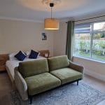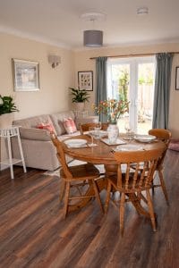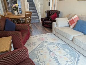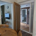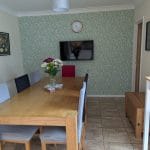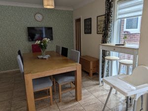 3-seater sofa. Round table with 4 chairs. Smart TV with Netflix and Prime. French doors to enclosed dog-proof garden. Stairs run from here. This is one of the possible places we can put spare beds if required, although they do take up most of the spare space.