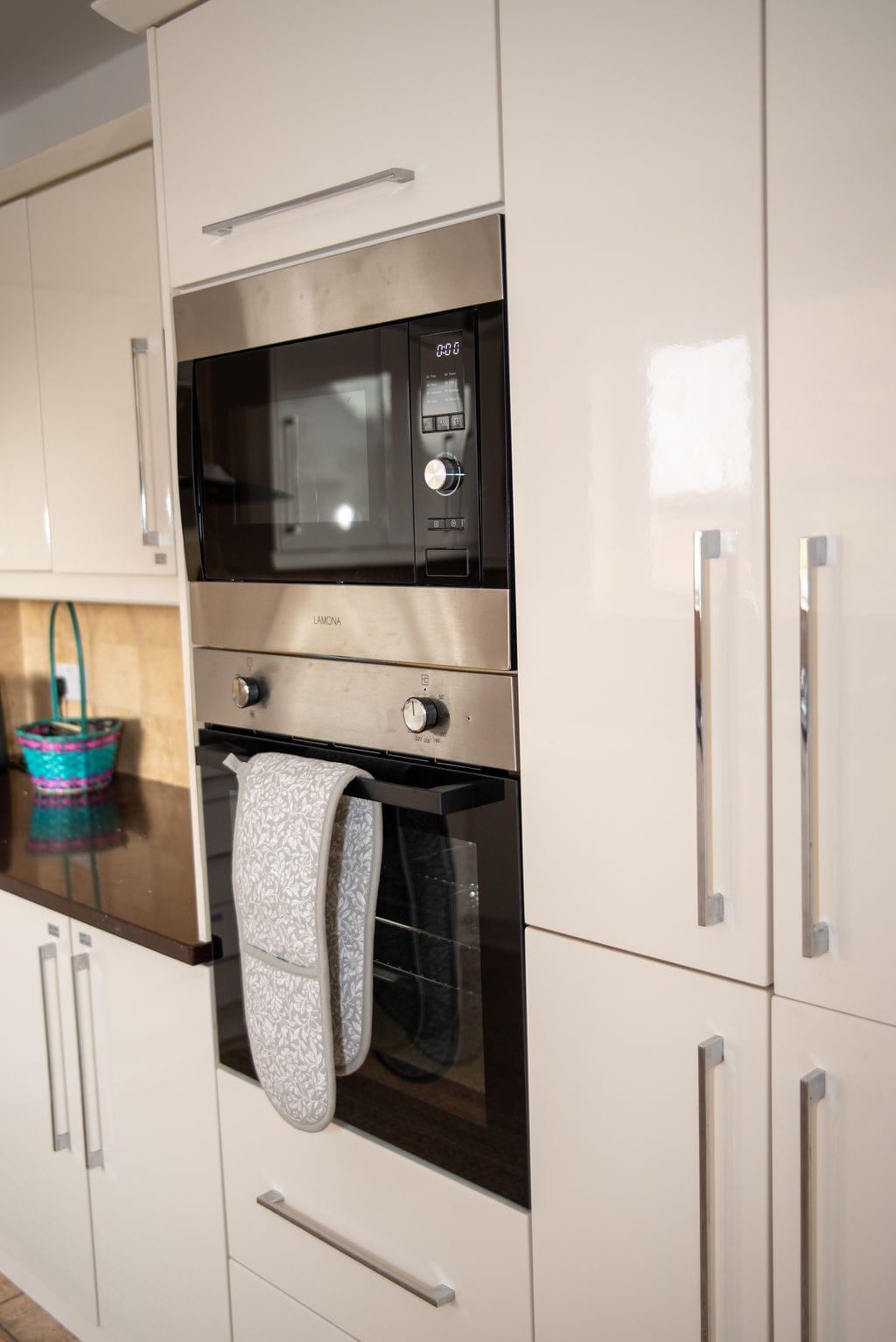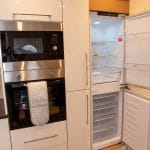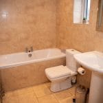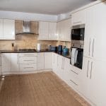 Dishwasher (a few tablets provided), 5-ring gas hob (lighter provided), oven, microwave, fridge, freezer, electric kettle, electric toaster, extractor hood and all the usual basic cooking utensils. Cutlery, crockery, glasses, mugs and tea towels. Fire blanket located by back door. Kitchen is off sitting room and leads to back door and Bathroom 4.