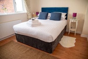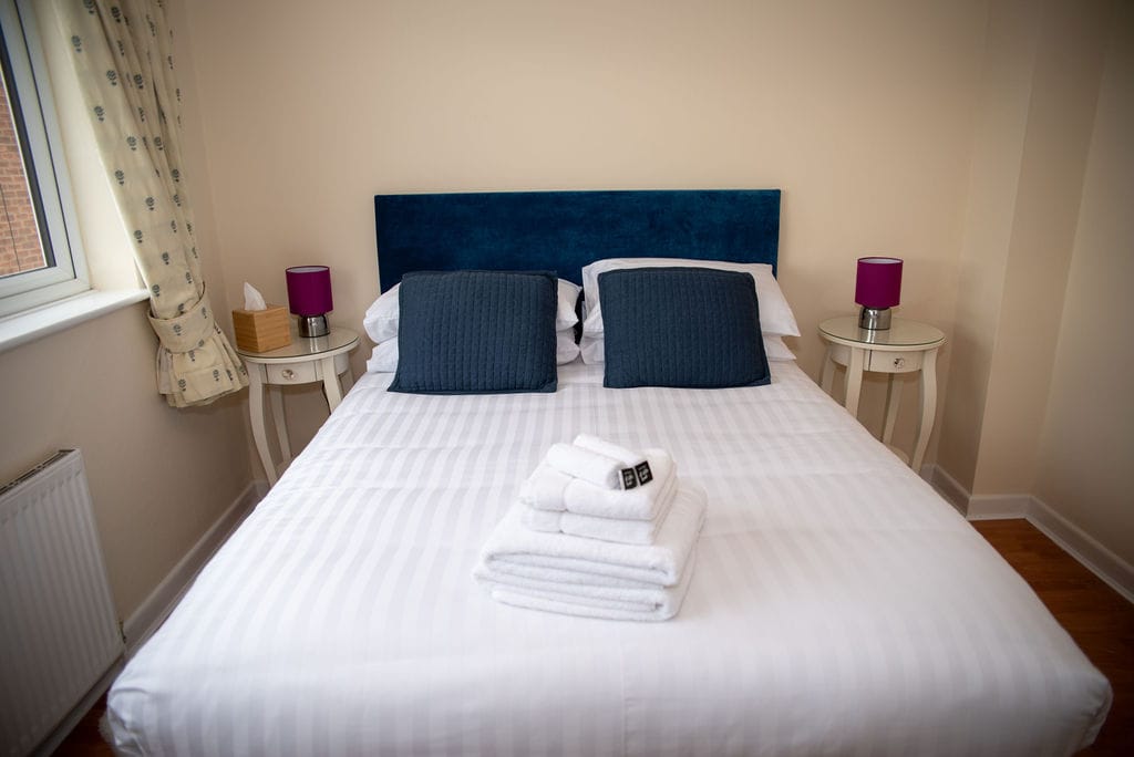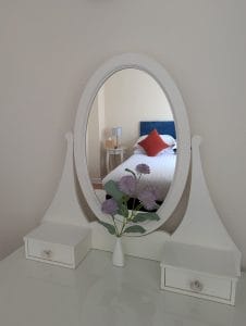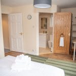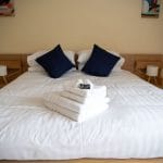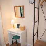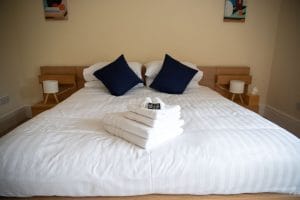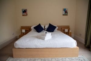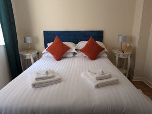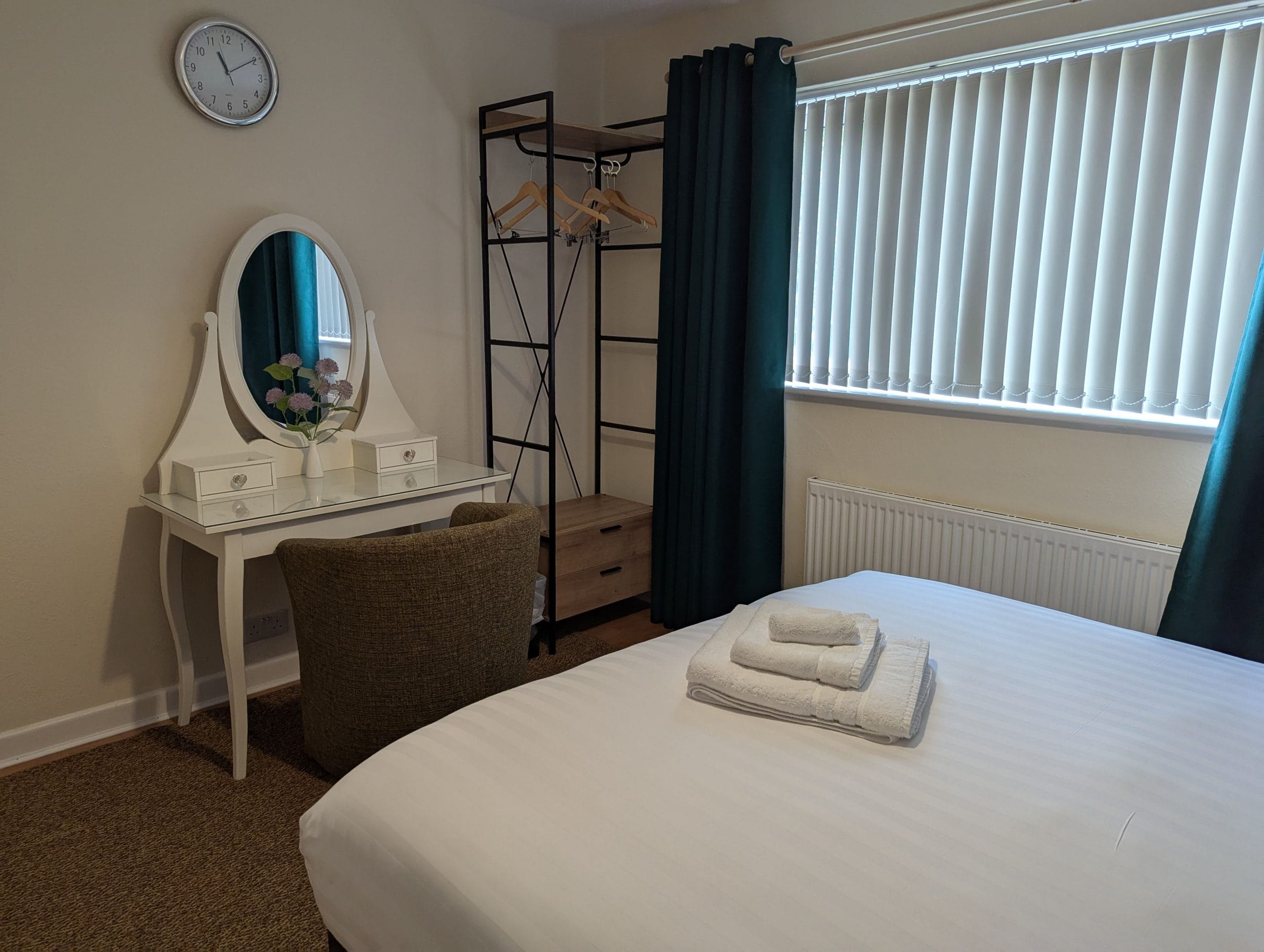 King-size bed (6′ 6″ long x 5′ wide). Hotel-quality towels and bed-linen provided. Blackout curtains over blackout blinds. Desk, stool, socket under desk, clothes storage, hairdryer.