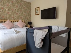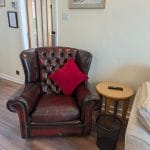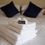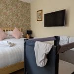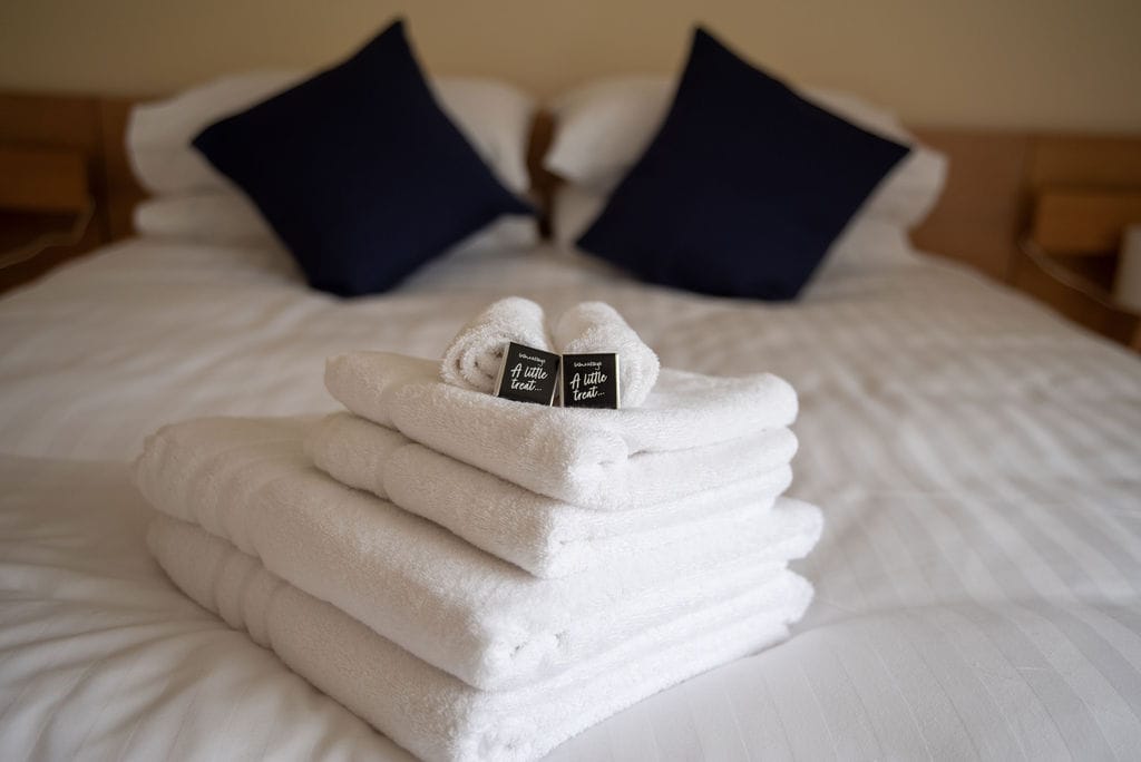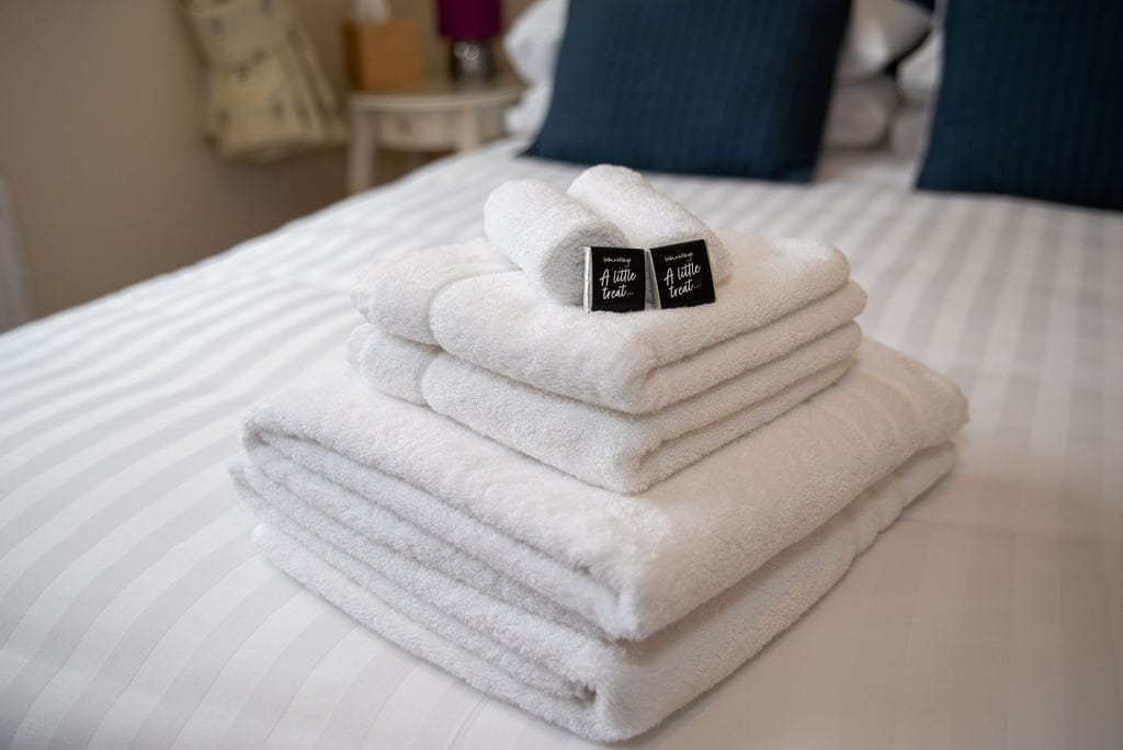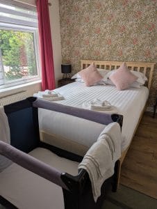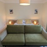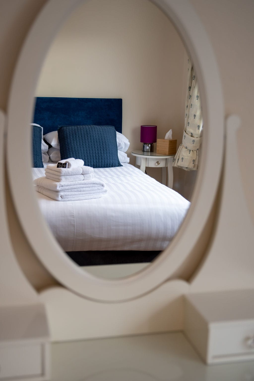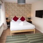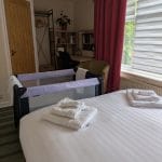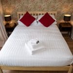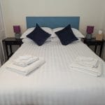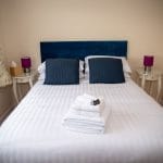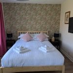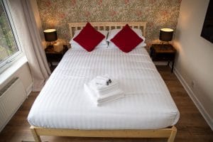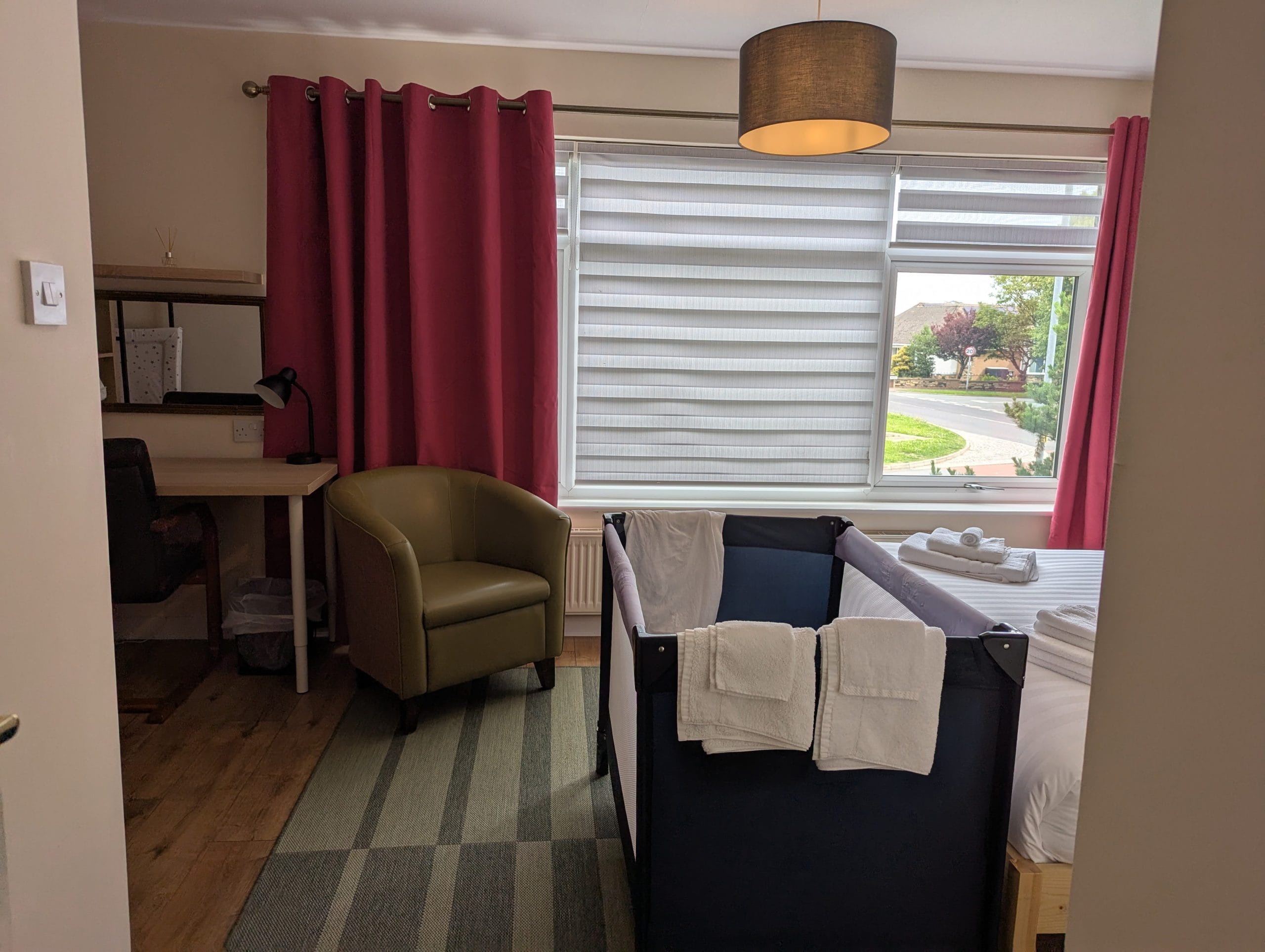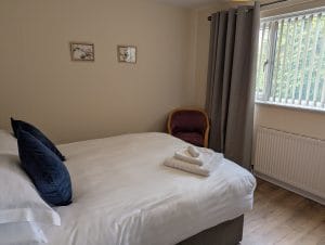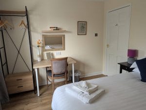 Double bed (6′ 3″ long x 4′ 6″ wide). Small armchair. Hotel-quality towels and bed-linen provided. Blackout curtains over blackout blinds. Desk, stool, socket under desk, clothes storage, hairdryer.