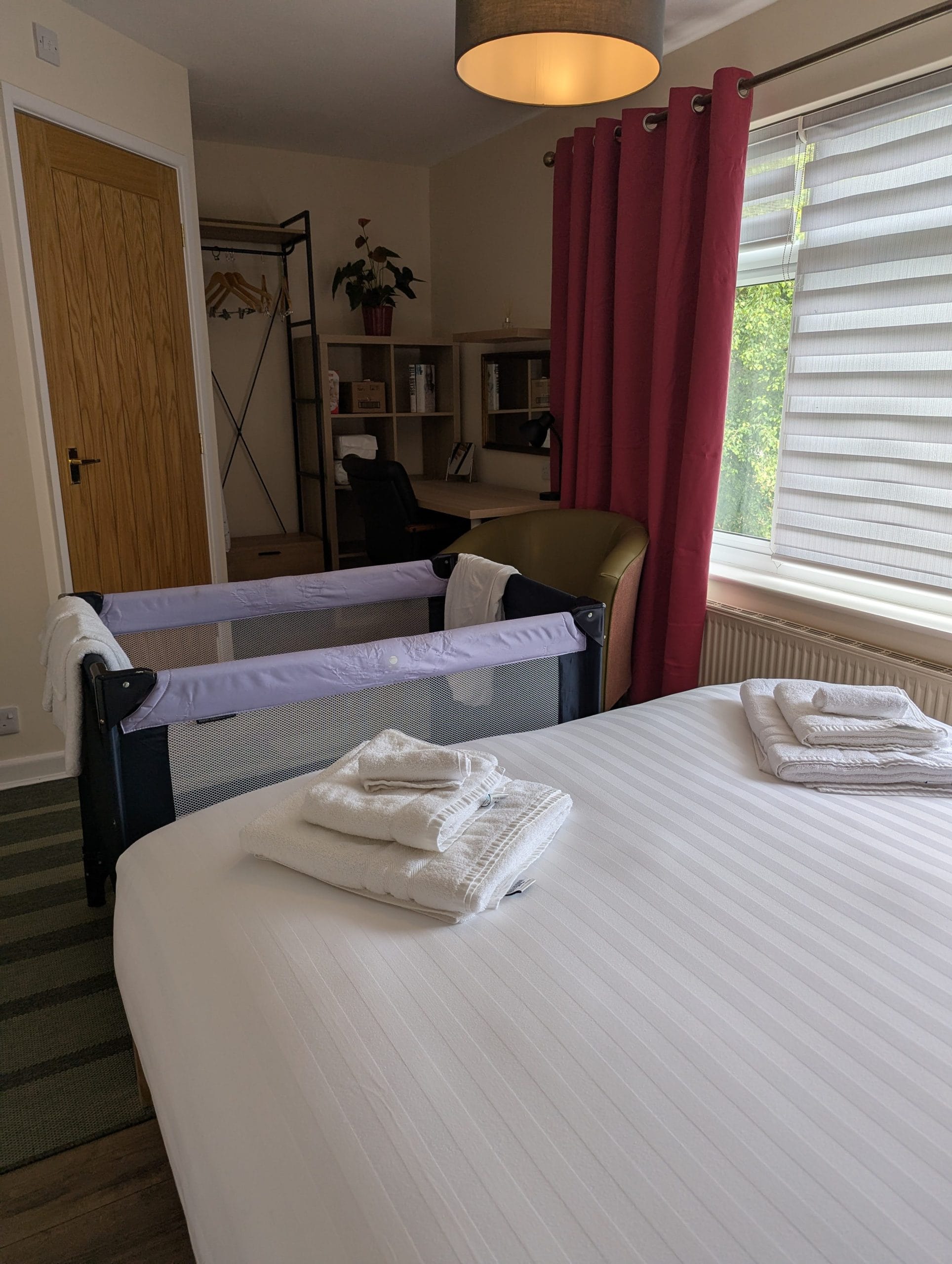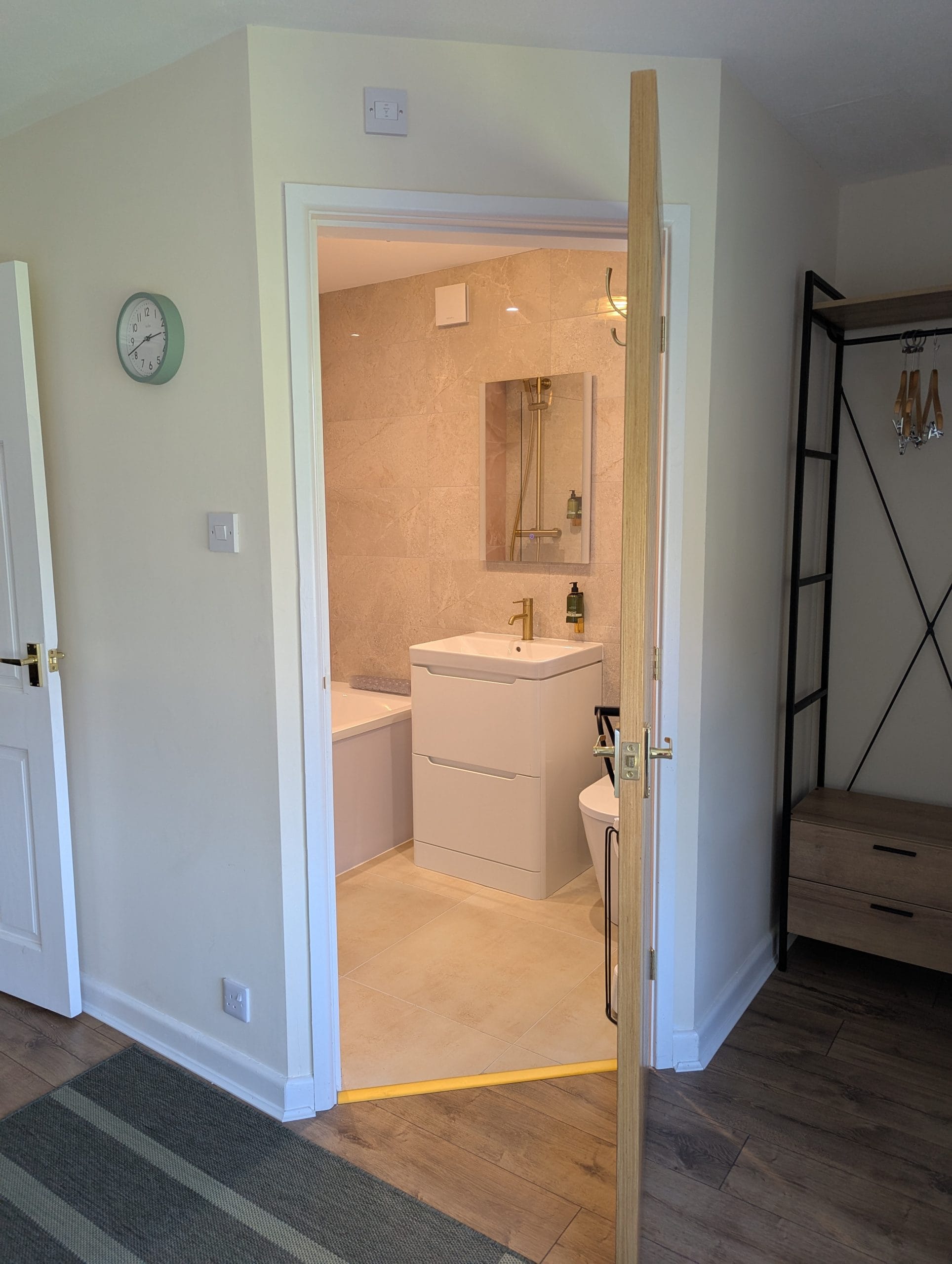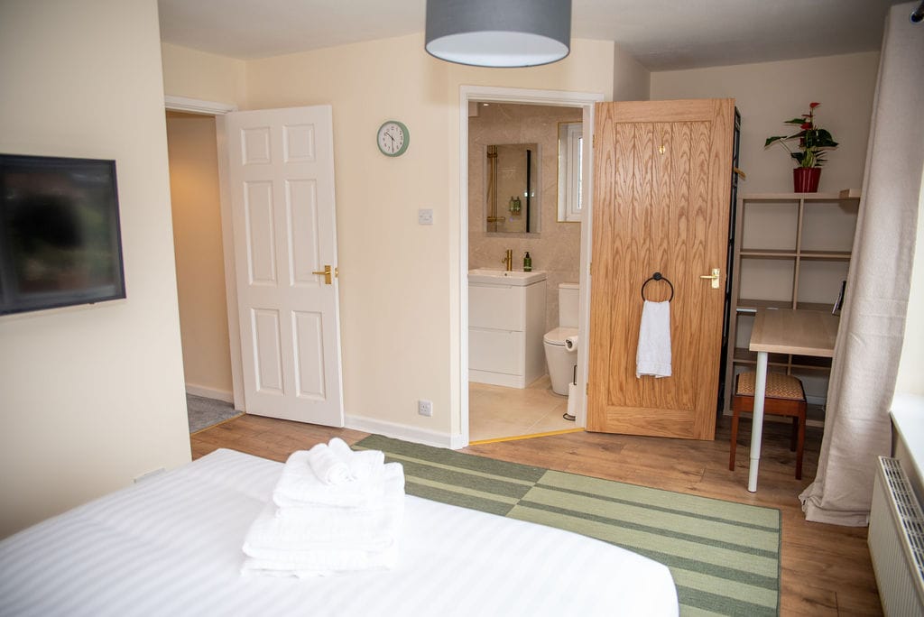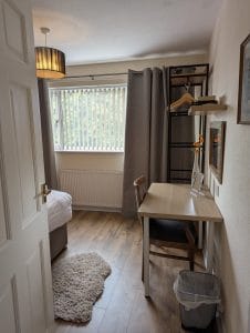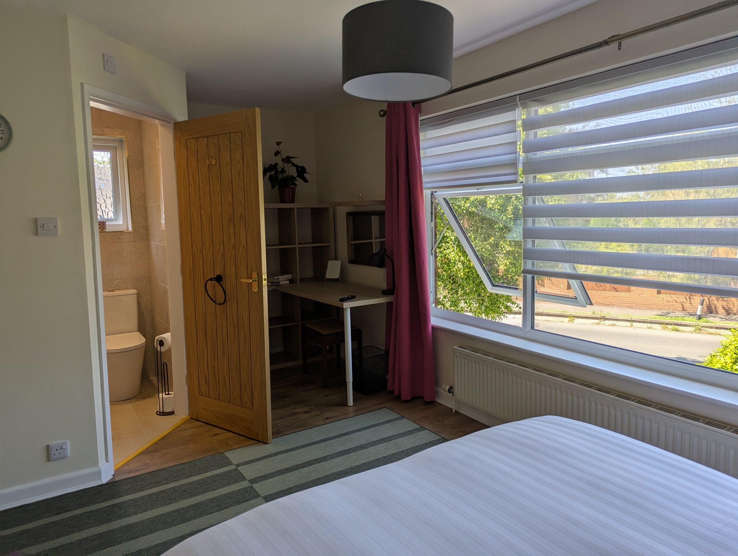 King-size bed (6′ 6″ long x 6′ wide). Ensuite bathroom (shower over bath). Hotel-quality towels and bed-linen provided. Smart TV with Netflix and Prime Video. Blackout curtains over privacy (non blackout) blinds. Desk, stool, Wifi repeater, socket under desk, clothes storage, shelves, hairdryer.