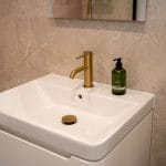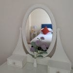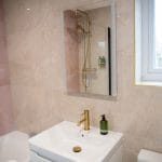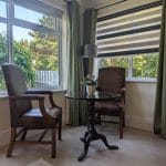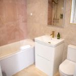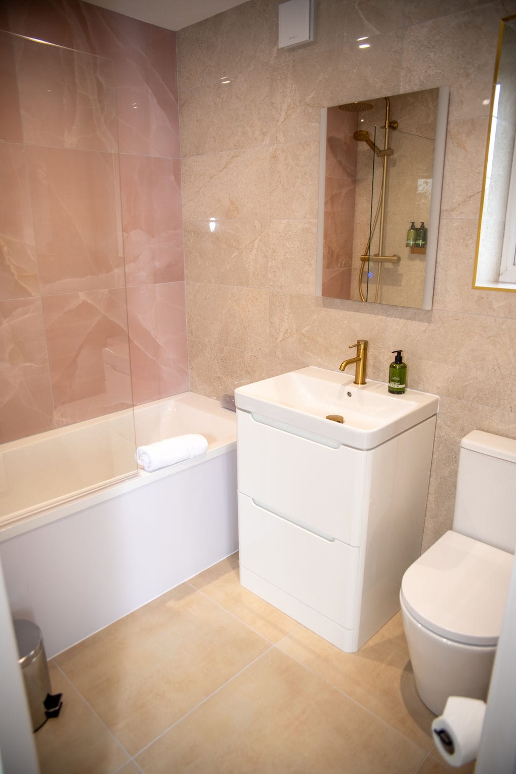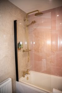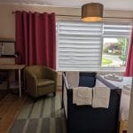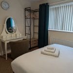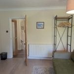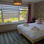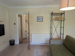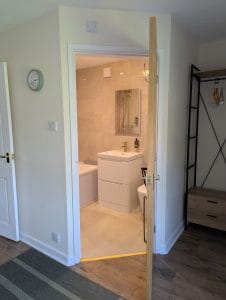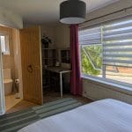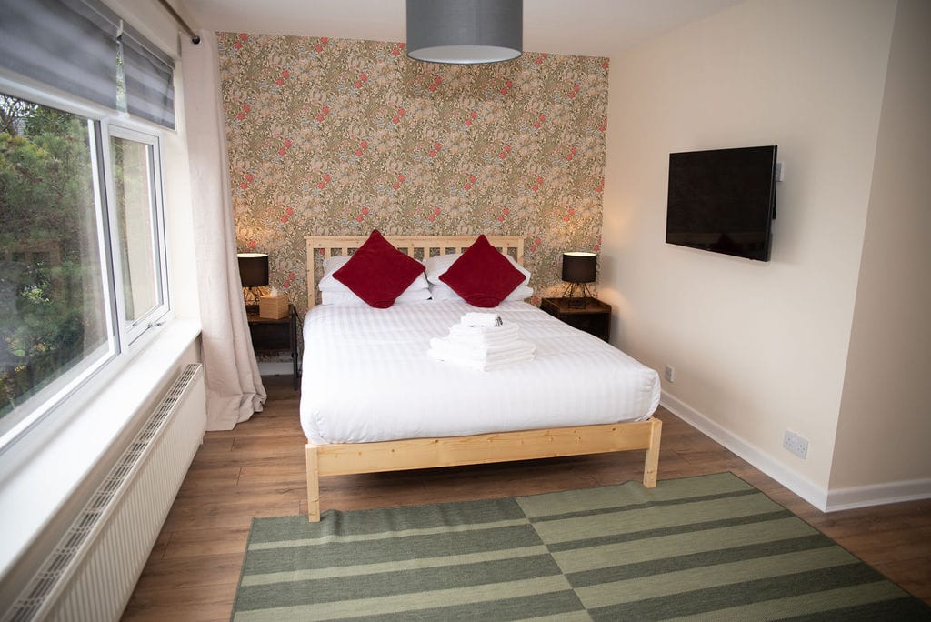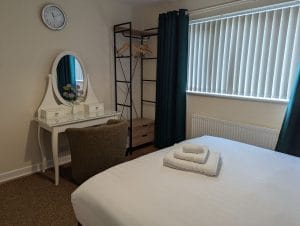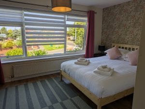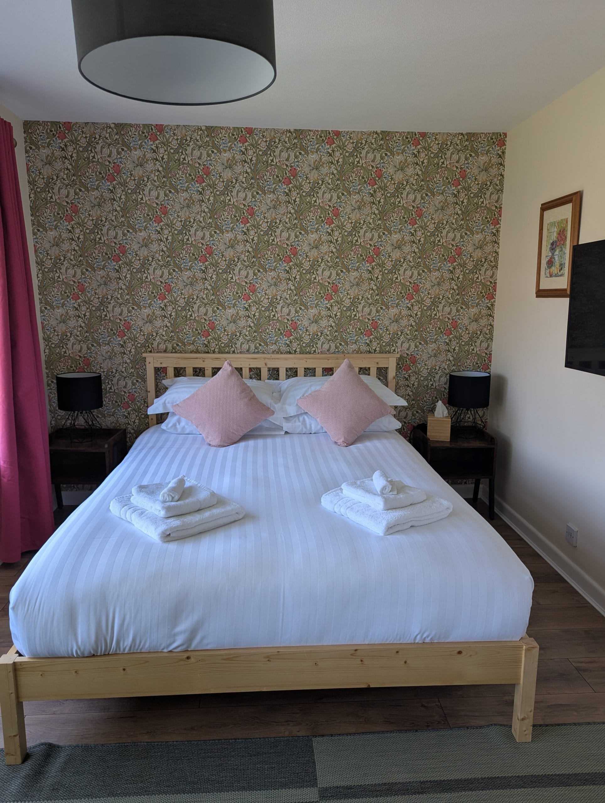 King-size bed (6′ 6″ long x 6′ wide). Ensuite bathroom (shower over bath). Hotel-quality towels and bed-linen provided. Smart TV with Netflix and Prime Video. Blackout curtains over privacy (non blackout) blinds. Desk, stool, Wifi repeater, socket under desk, clothes storage, shelves, hairdryer.