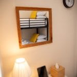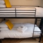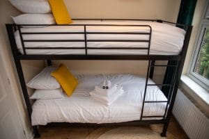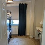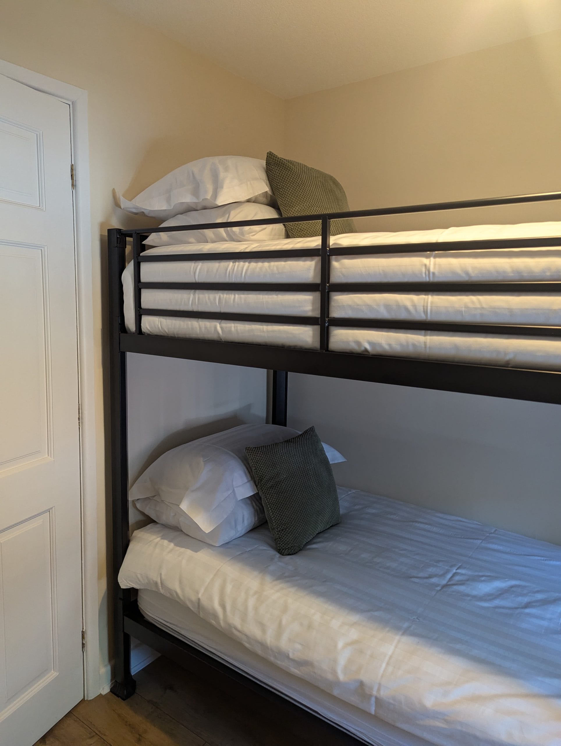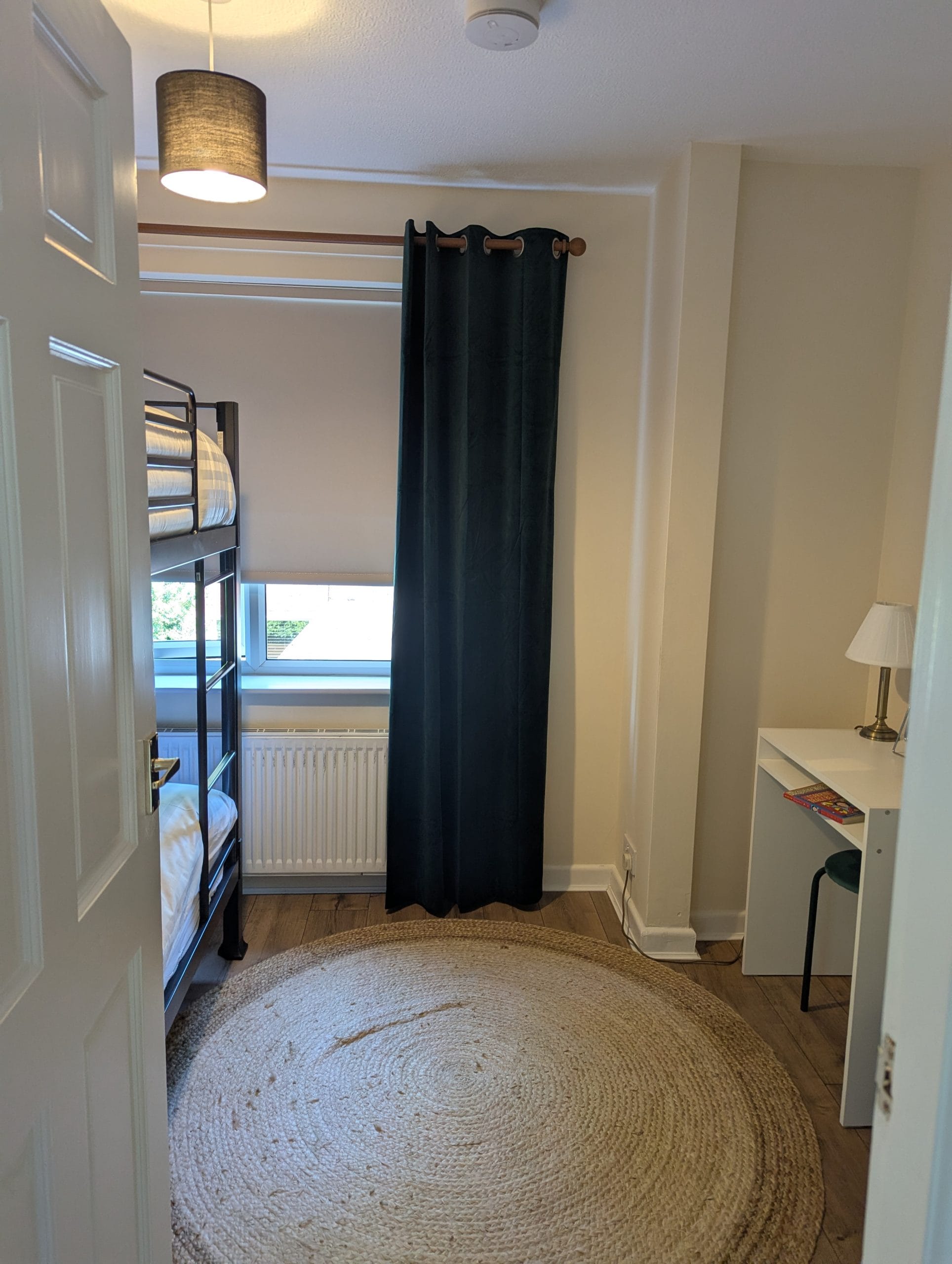 Adult-quality bunk beds (both beds 6′ 3″ long x 3′ wide). Hotel-quality towels and bed-linen provided. Blackout curtains over blackout blinds. Desk, stool, socket under desk, clothes storage, hairdryer.