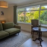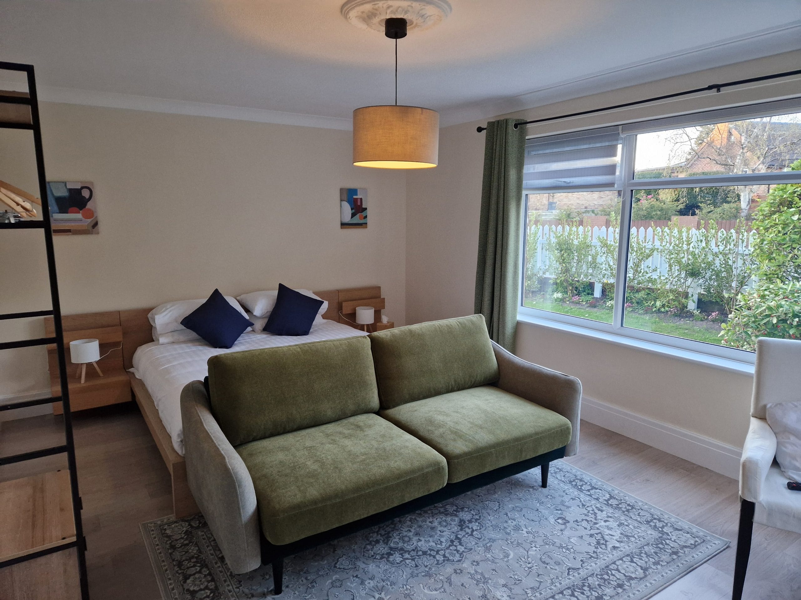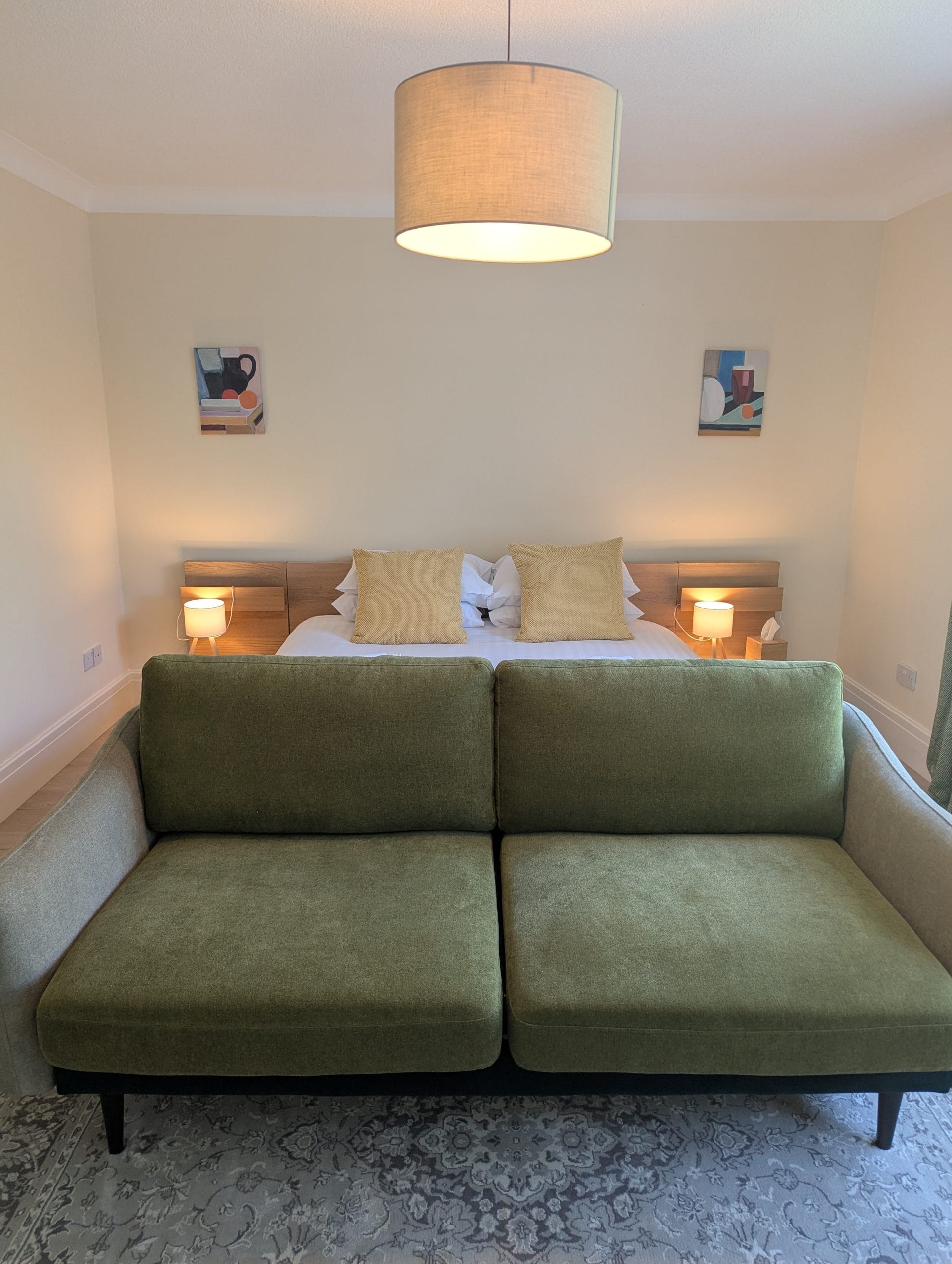 Superking-size bed. Dual aspect room with garden view. Hotel-quality towels and bed-linen provided. Blackout curtains over privacy (not blackout) blinds. 3-seater sofa. Table and chairs. Clothes storage, hairdryer. Bathroom 3 (off the hallway, see below) is convenient for this bedroom.